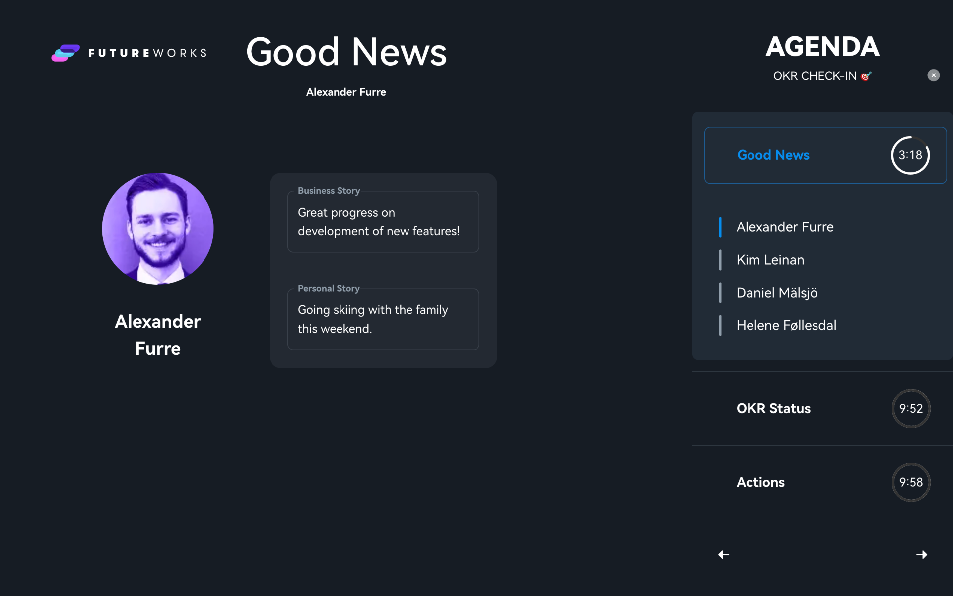 Choose a template, OKR Check-In, Friday Wins, and launch. Each agenda point is timed. Each participant gets their spotlight for Good News, OKR status, and actions. Recurring check-ins go from chaotic catch-ups to focused, time-boxed sessions.