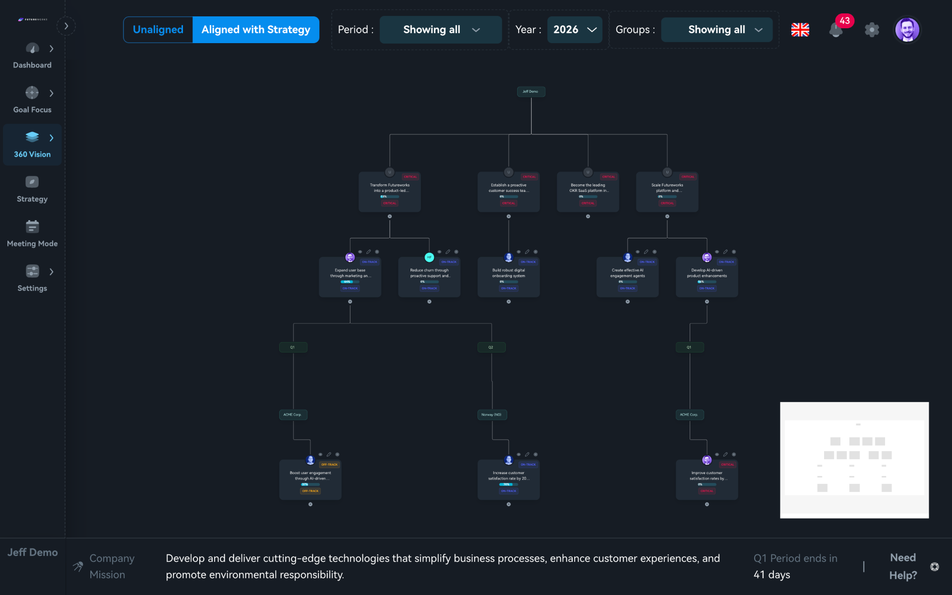 The 360 Vision tree maps how strategic priorities branch into departmental OKRs and down to individual objectives. Toggle between aligned and unaligned views to spot gaps. Filter by period, year, or group. Every node carries a colour-coded status badge.