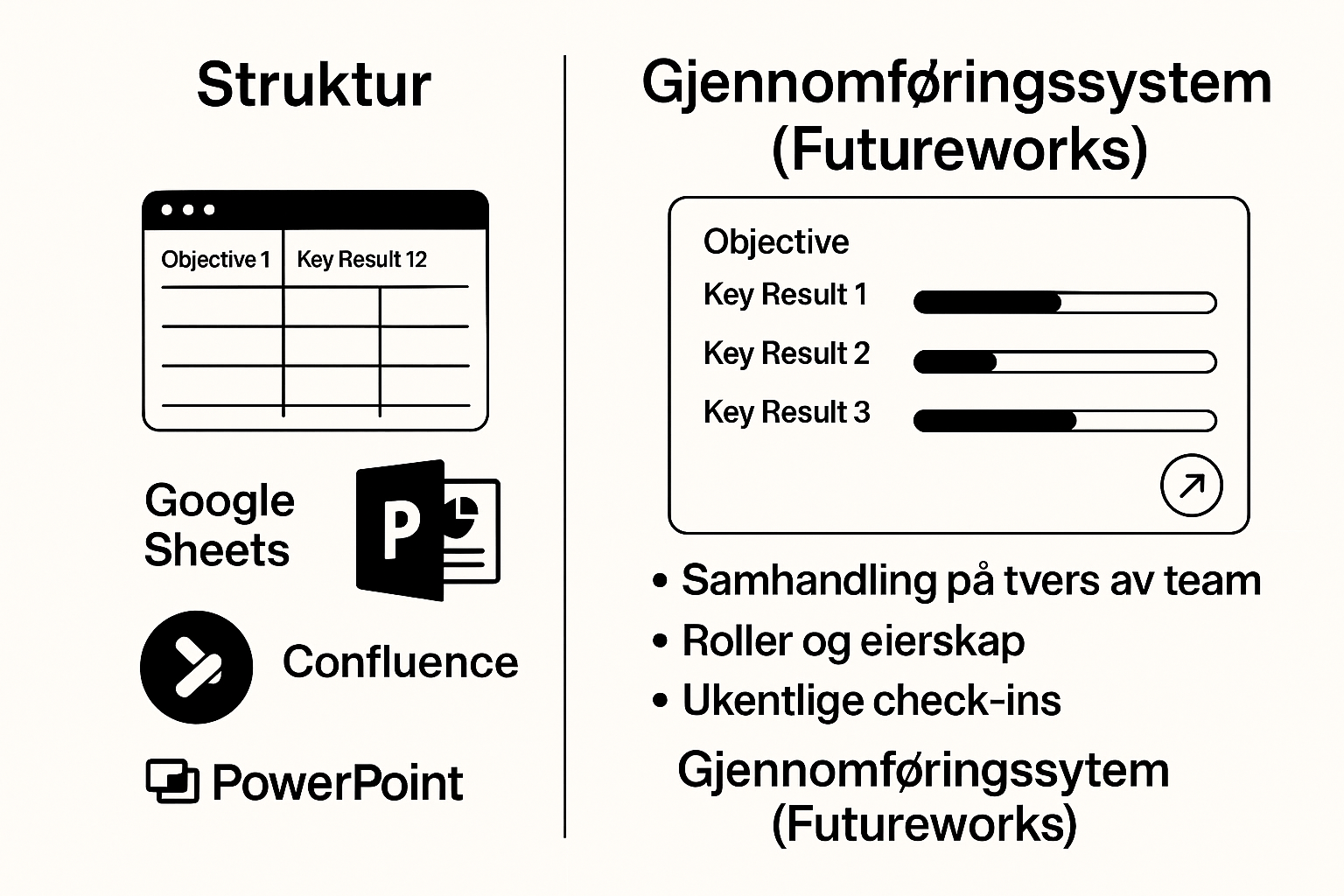 Mange starter godt: Strategi forankres OKRs settes Deles i Google Sheets, PowerPoint eller Teams Men så skjer det som alltid…
